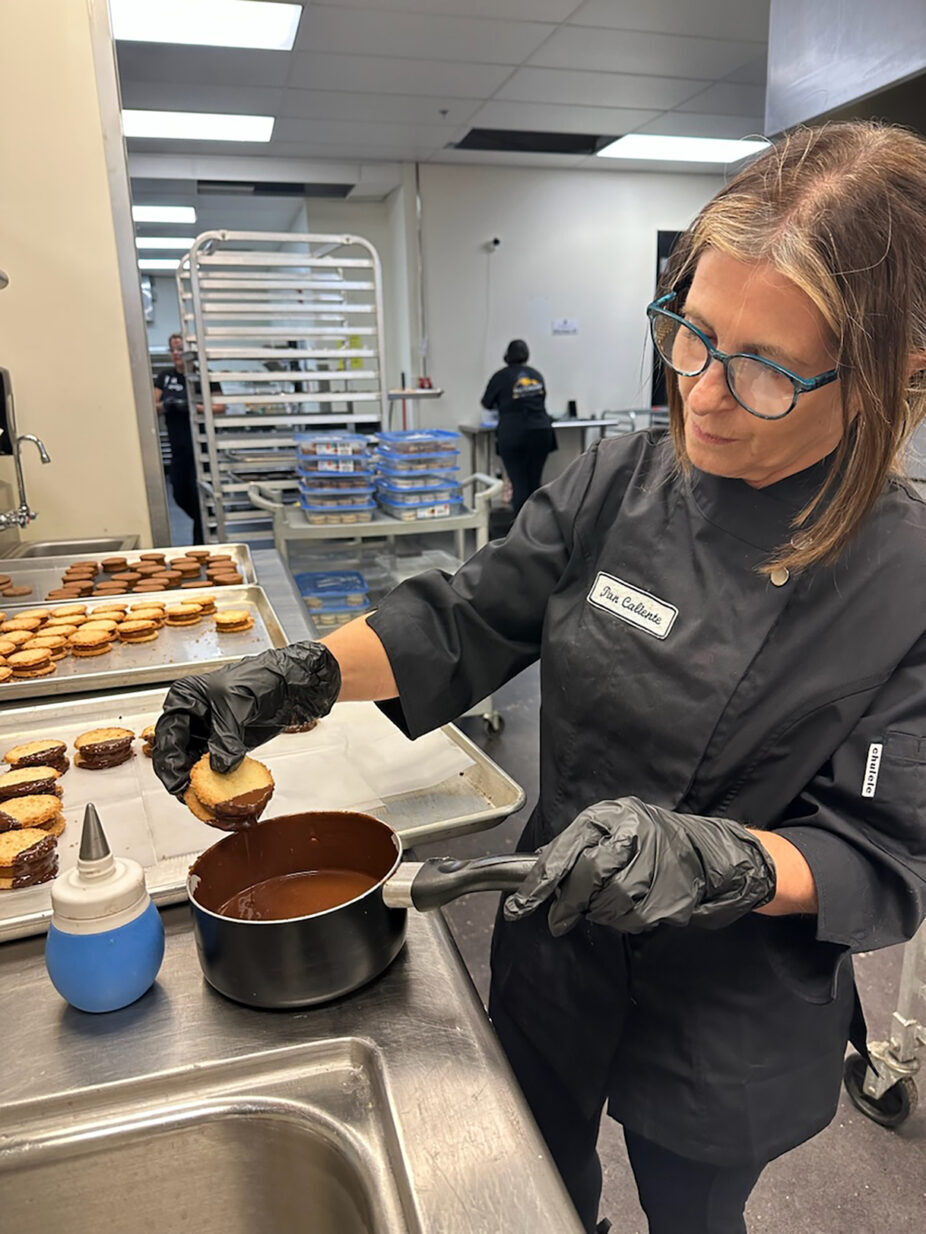Silvia Miguel dips alfajores in chocolate at Pan Caliente’s kitchen at the Ennovation Center in Independence; photo by Joyce Smith