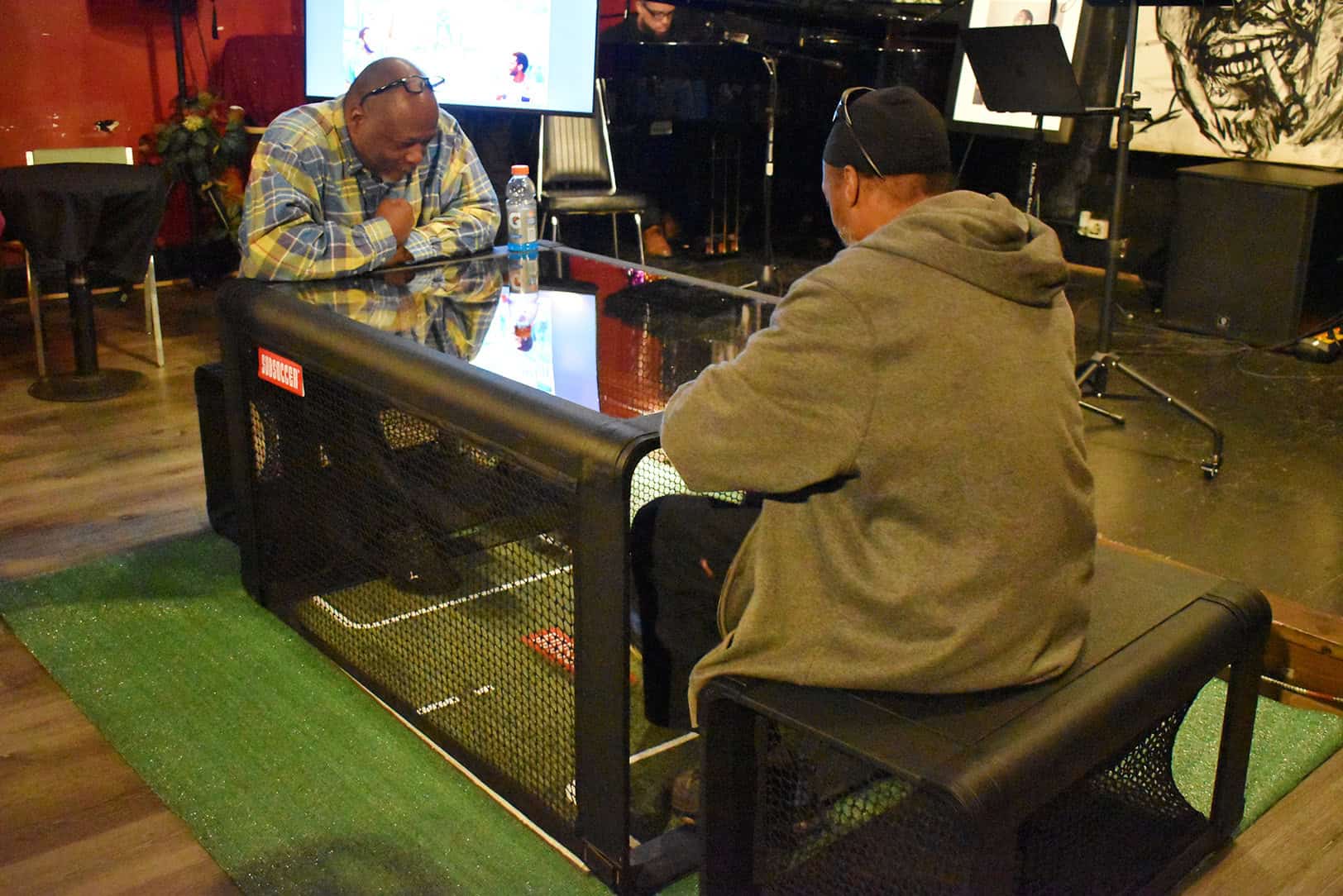 Two men demonstrate a game of table soccer, one of many activations planned for the historic 18th and Vine District this summer; photo by Taylor Wilmore, Startland News