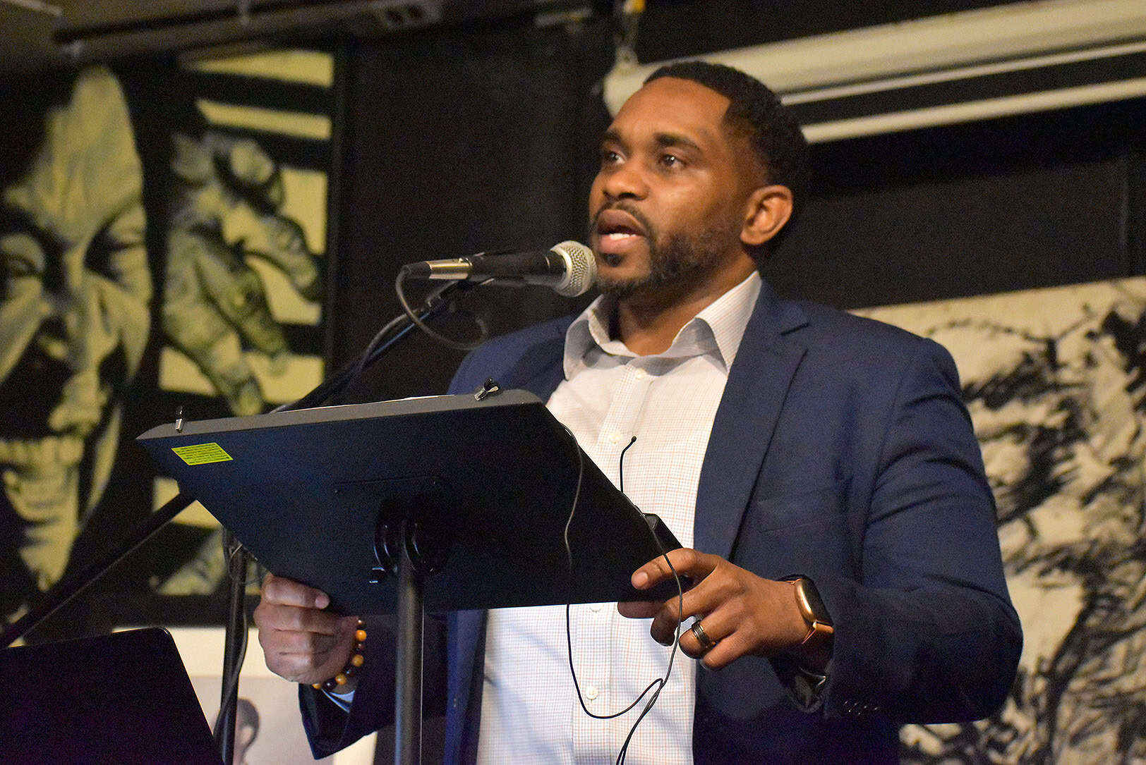Dennis Powell, executive director of the TSOS “Do Good” Foundation, speaks during a press conference announcing plans for 18th and Vine activations during this summer’s World Cup; photo by Taylor Wilmore, Startland News