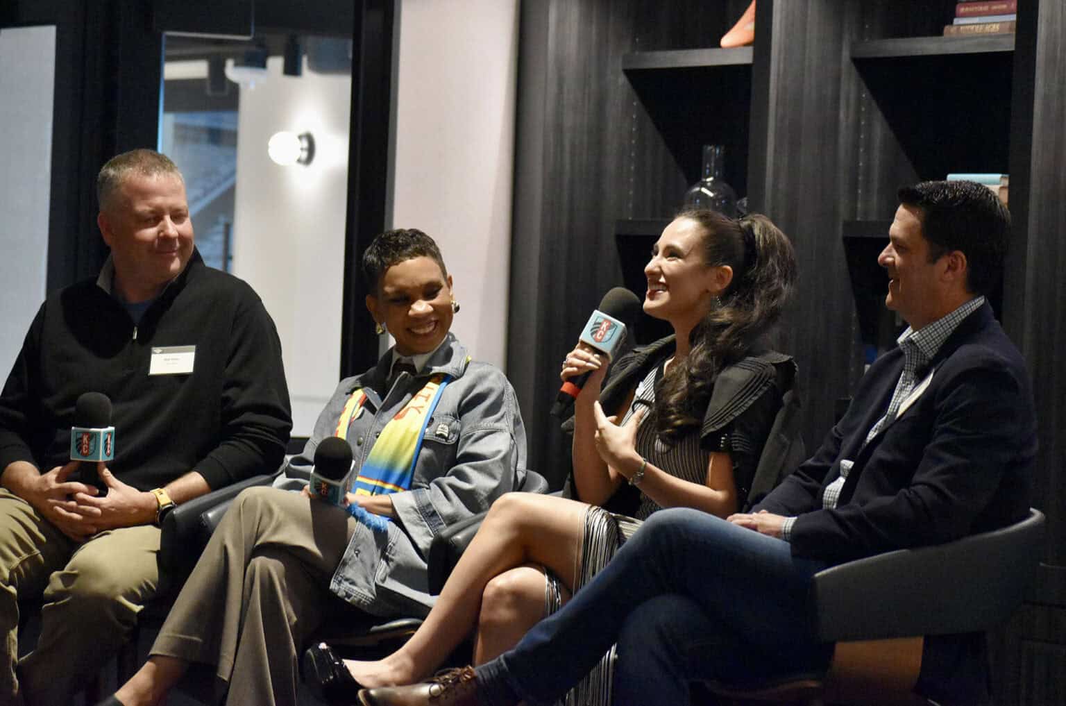 Nia Webster, assistant director of the neighborhood services department for the city of Kansas City, Missouri, second from left, smiles during a panel conversation on World Cup readiness at CPKC Stadium, alongside small business owners Matt Shatto, Dulcinea Herrera, and James Westphal. Webster shared insights from the city’s City of Entrepreneurs initiatives during the Bank of America and Startland News-led event; photo by Nikki Overfelt Chifalu, Startland News