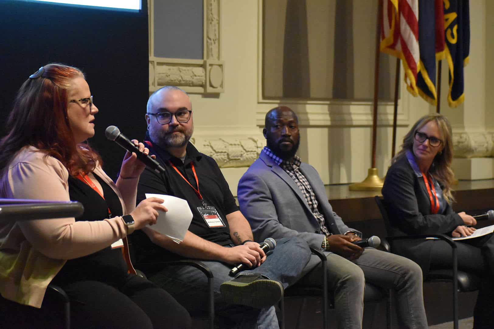 Diana Alt, founder of Diana Alt Coaching and Consulting, left, leads a c3KC panel on AI at Work, alongside Anthony Tackett, global creative director at Hill’s Pet Nutrition; John Duker, services client director at ServiceNow; and Kristen Guillaume, chief information and digital officer at NKC Health; photo by Taylor Wilmore, Startland News