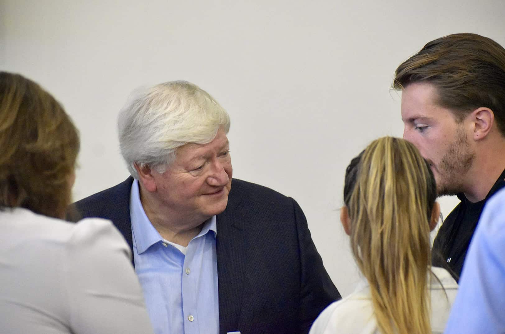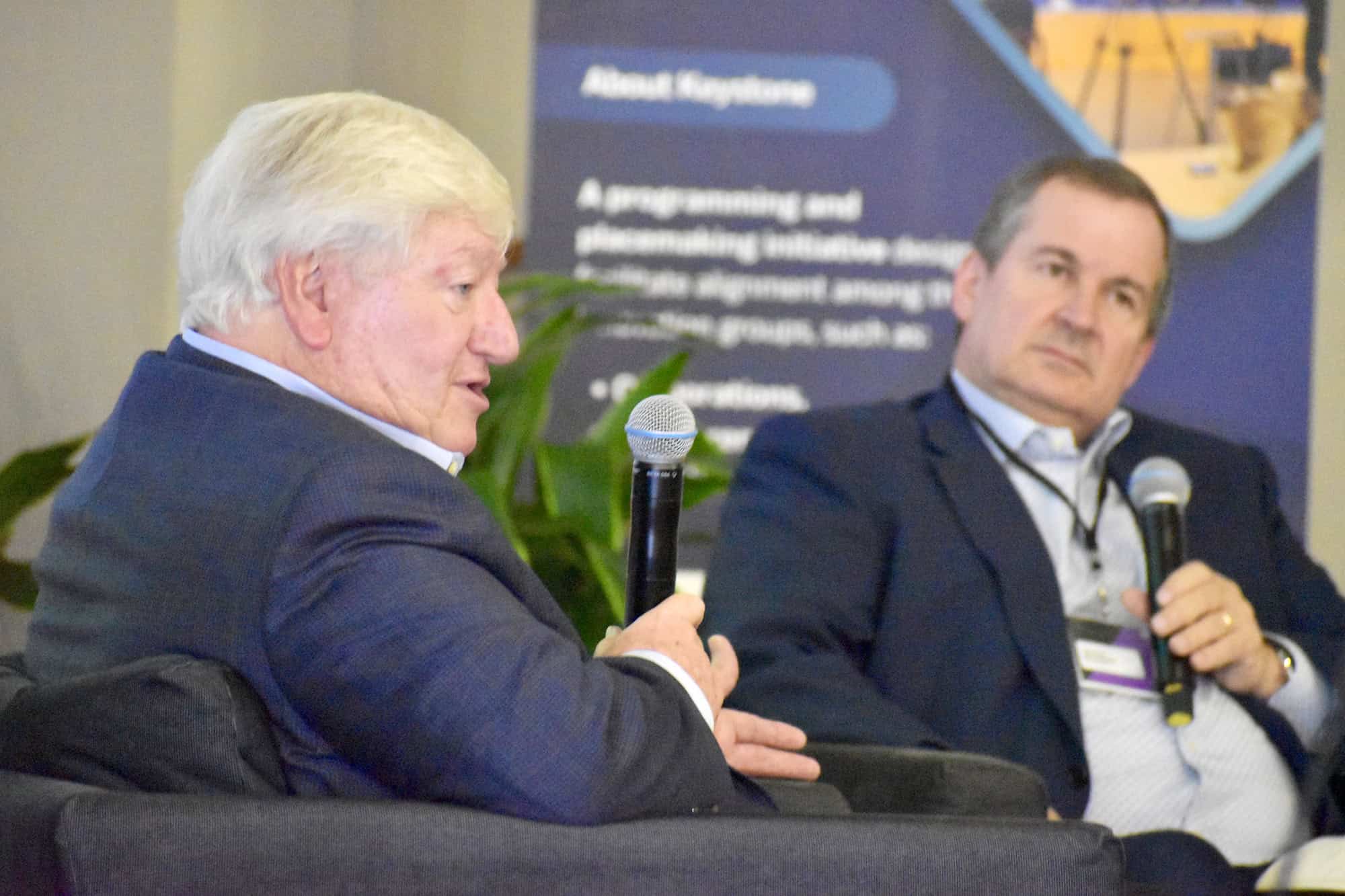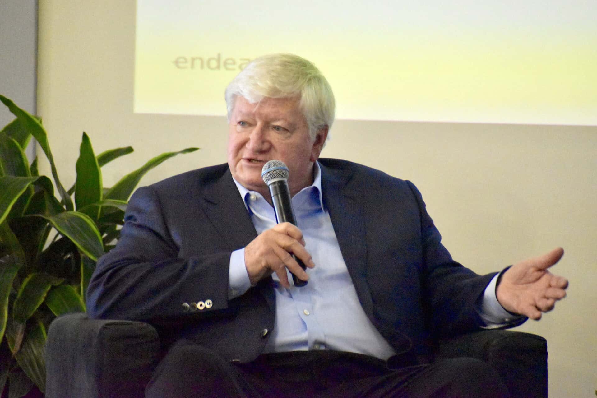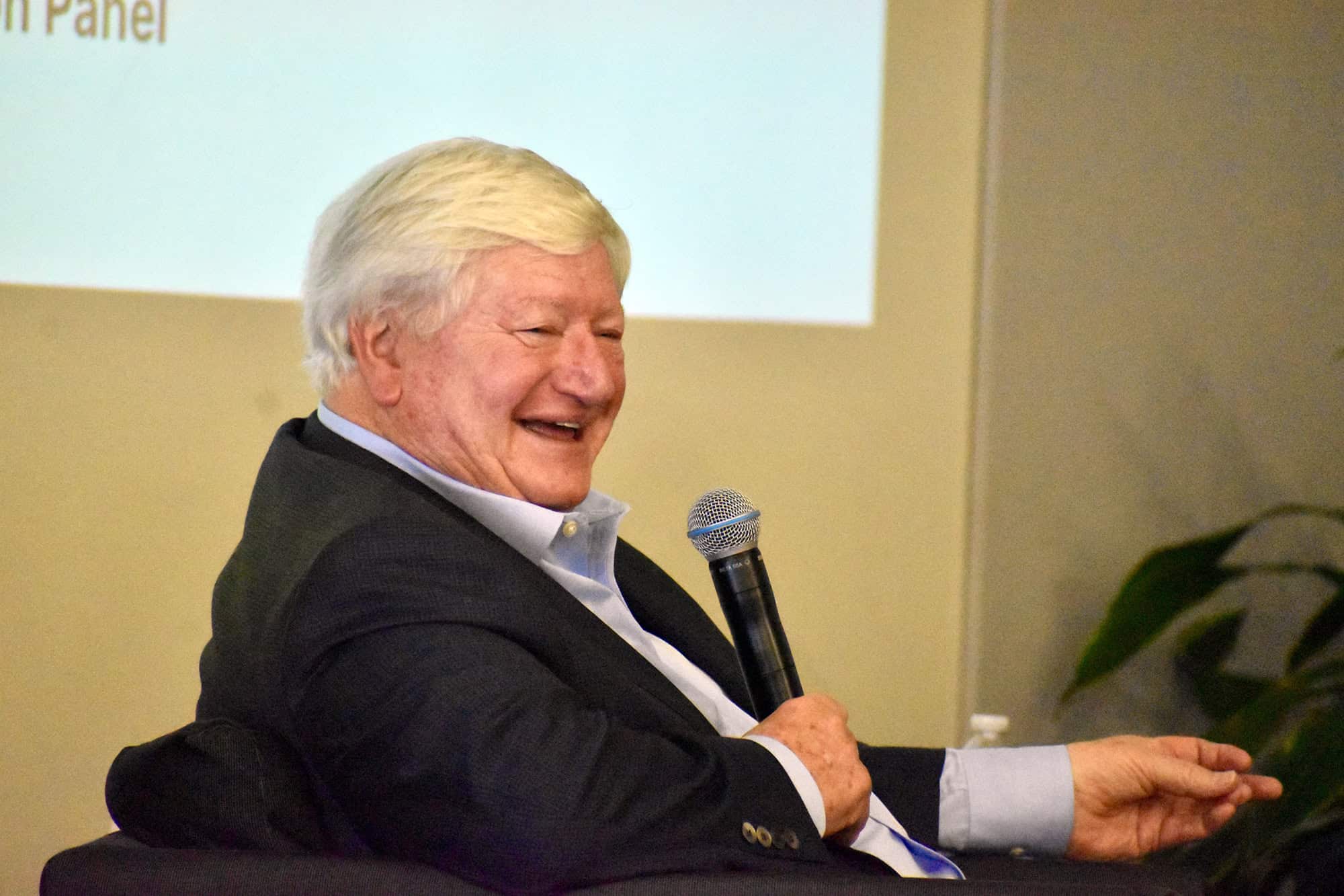 Cliff Illig, co-founder of Cerner and longtime Sporting KC owner, smiles on stage at Keystone CoLabs; photo by Nikki Overfelt Chifalu, Startland News