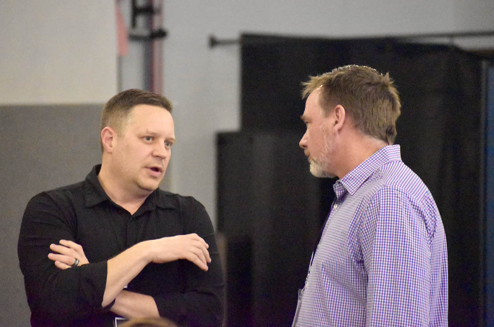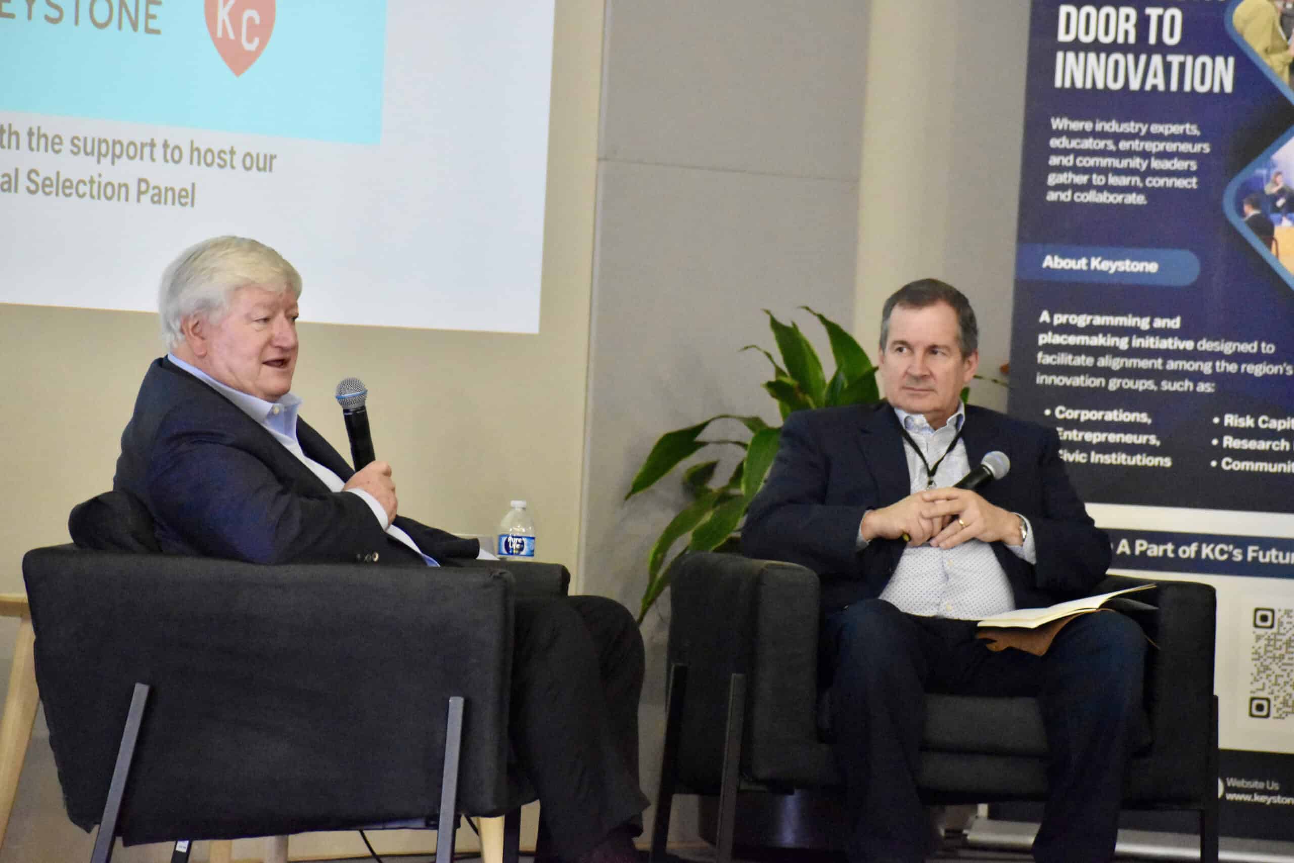 Cliff Illig laughs on stage alongside Clete Brewer, managing partner of NewRoad Capital Partners and board member of Bentonville, Arkansas-based Endeavor Heartland, at Keystone CoLabs in Kansas City; photo by Nikki Overfelt Chifalu, Startland News