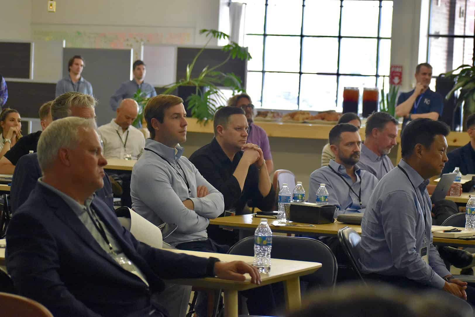 A crowd of entrepreneurs and investors listens to Cliff Illig speak during a summit at Keystone CoLabs; photo by Nikki Overfelt Chifalu, Startland News