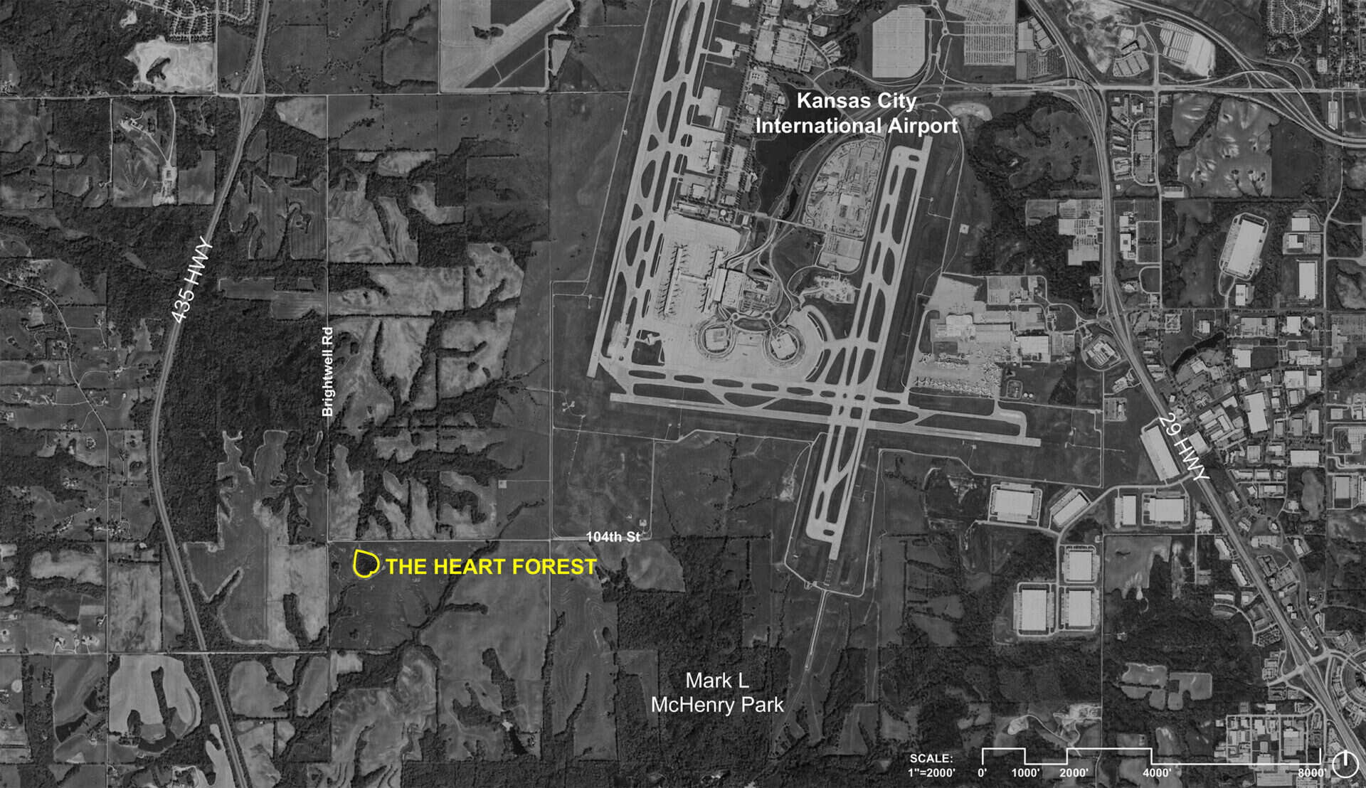 A location map shows the Heart Forest’s relation and proximity to Kansas City International airport; courtesy image