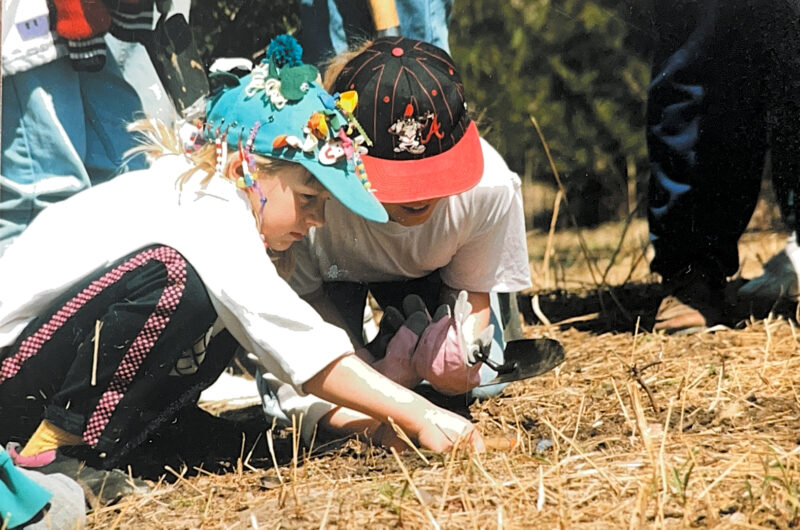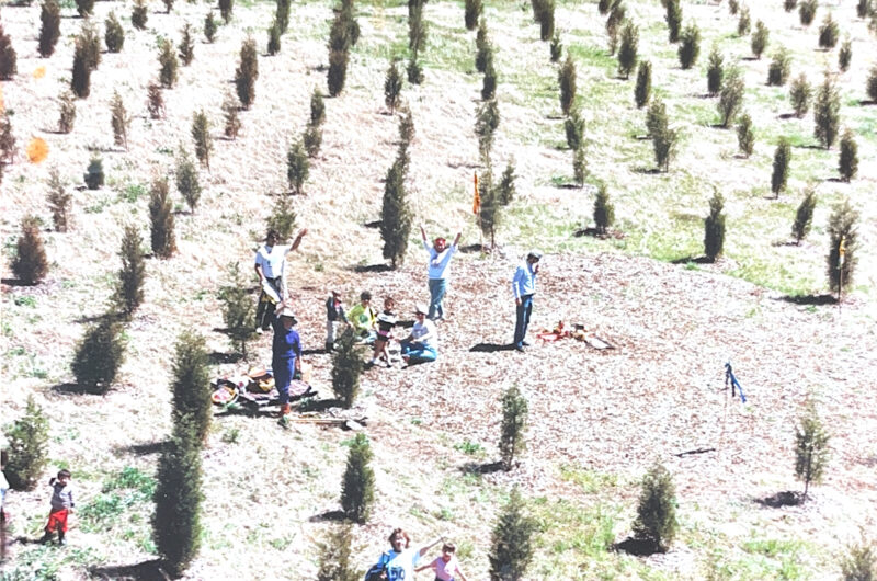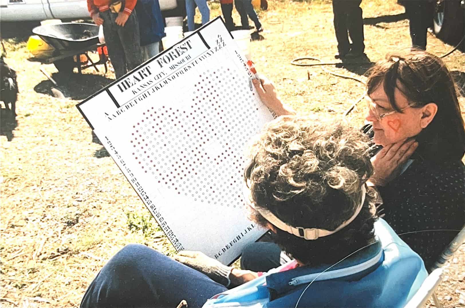Volunteers hold a planting map for the Heart Forest during a tree planting event in 1990; courtesy photo