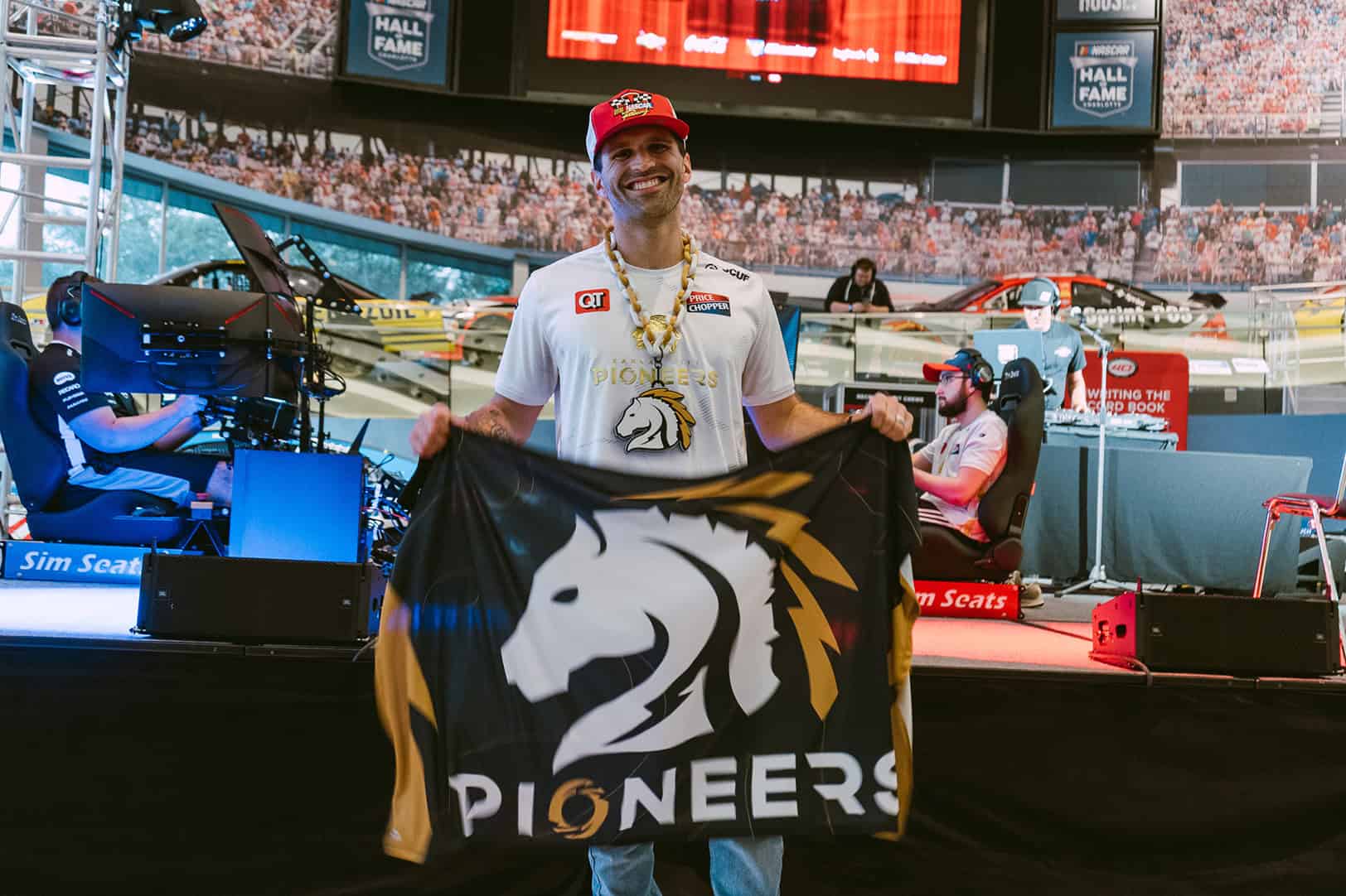Sam Kulikov, Kansas City Pioneers, holding the Pioneers’ flag at an eNASCAR Championship event; courtesy photo