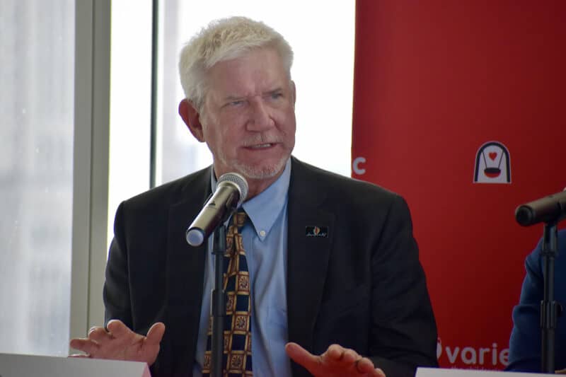 Peter and Veronica Mallouk announce a $5.1 million investment — part of a $30 million initiative — during a press conference at the Blue Cross Blue Shield office building overlooking the future Roy Blunt Luminary Park; photo by Nikki Overfelt Chifalu, Startland News