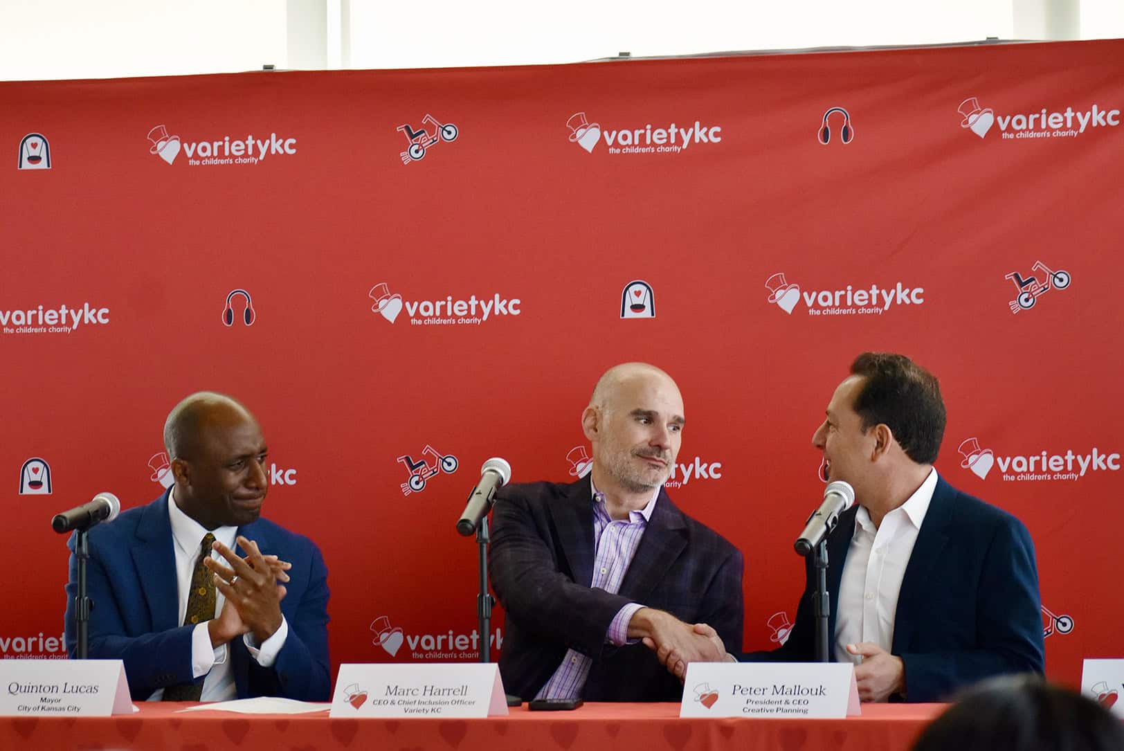 Marc Harrell, CEO and chief inclusion officer of Variety KC, shakes hands with Peter Mallouk during a press conference overlooking the future Roy Blunt Luminary Park; photo by Nikki Overfelt Chifalu, Startland News