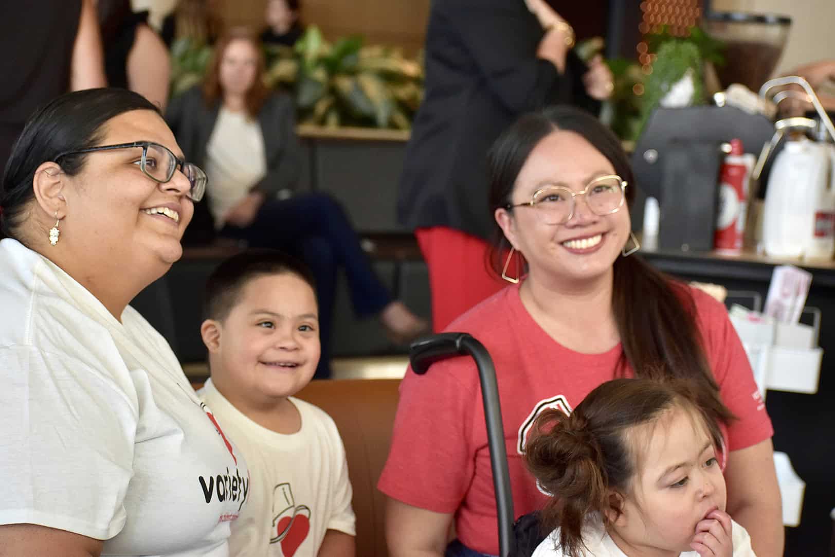 Linda Marron and her son Kayden, and Katy Shepherd and her daughter Mila, who are among families served by Variety KC, listen during a press conference for a new play area at the future Roy Blunt Luminary Park; photo by Nikki Overfelt Chifalu, Startland News