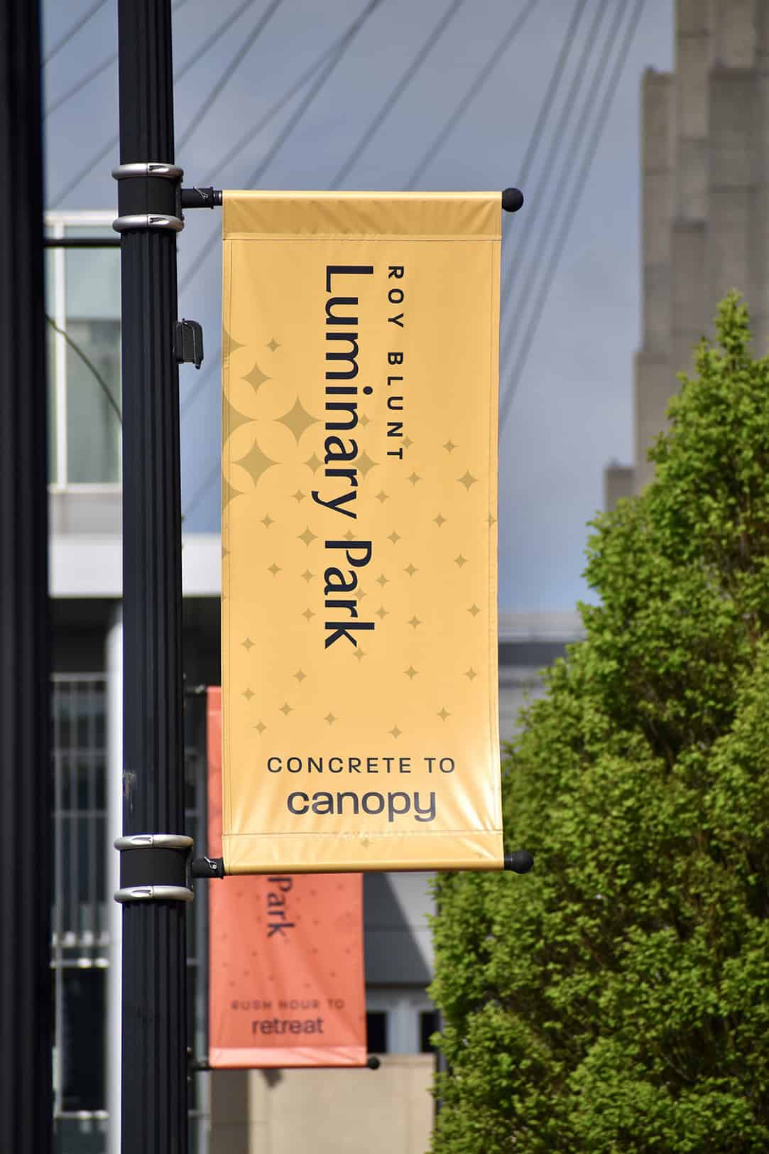 Banners hang in downtown Kansas City near the site of the future Roy Blunt Luminary Park; photo by Nikki Overfelt Chifalu, Startland News