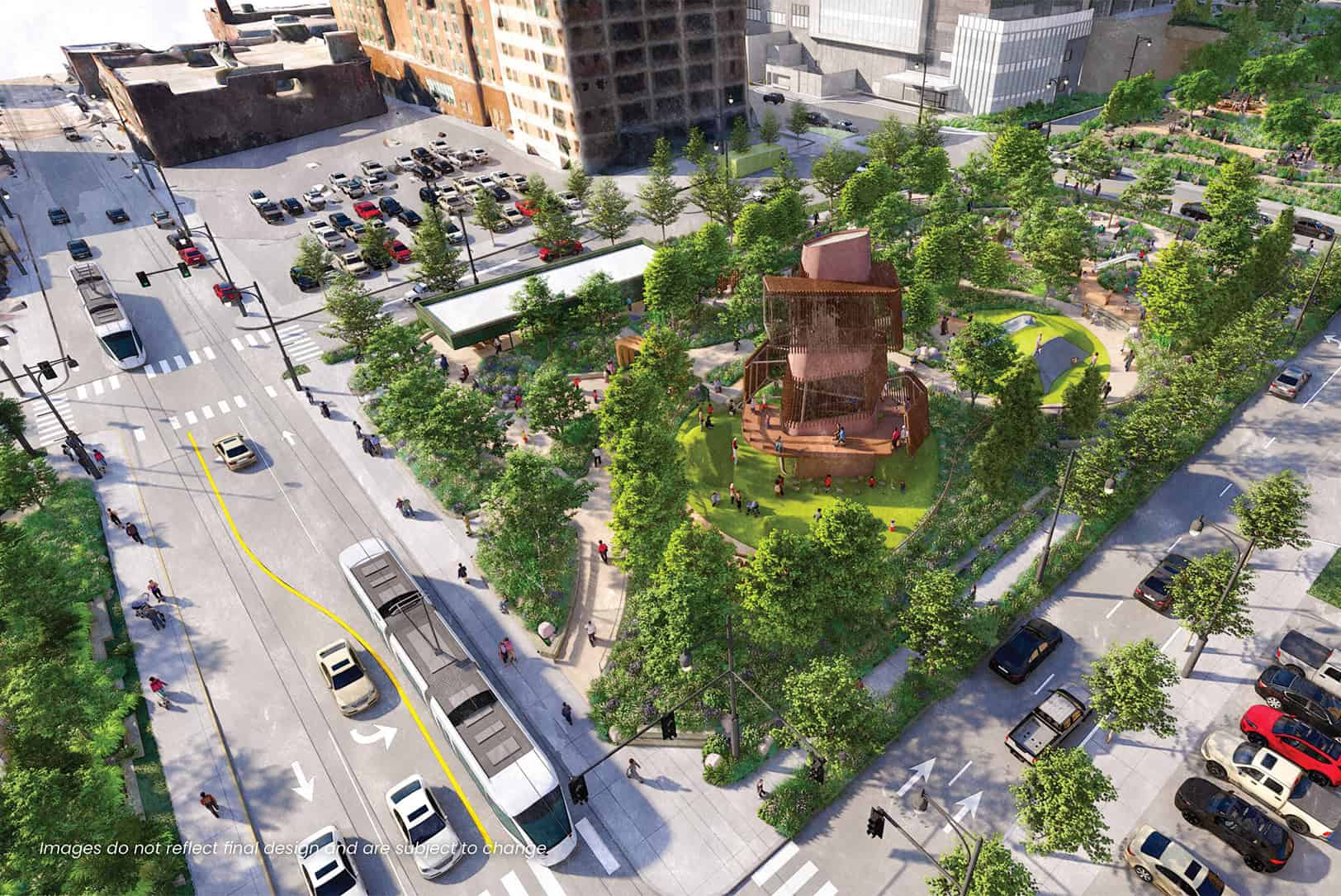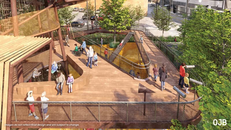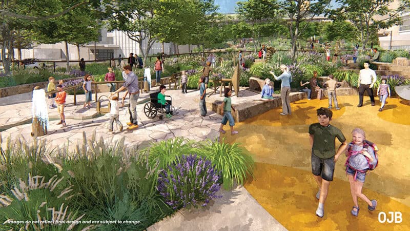 A rendering shows a ground-level view of inclusive play plans for Roy Blunt Luminary Park; renderings courtesy of OJB Landscape Architecture