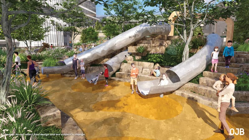 A playground rendering shows the all-abilities play space envisioned for Roy Blunt Luminary Park; renderings courtesy of OJB Landscape Architecture