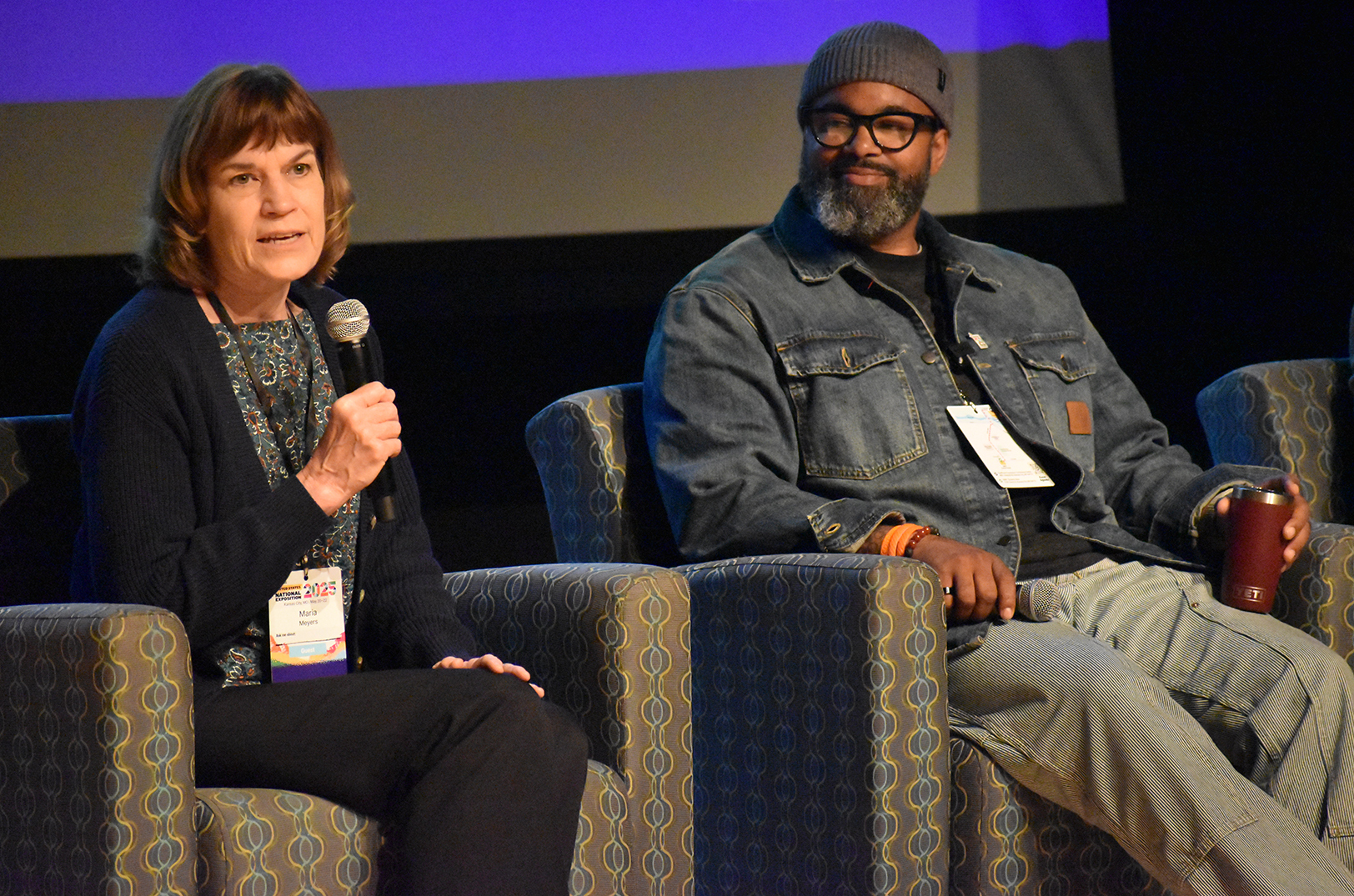Maria Meyers, executive director for UMKC’s Innovation Center, speaks alongside Dan Smith, co–founder of The Porter House KC, during a 2025 panel on Kansas City entrepreneurship at UMKC; photo by Taylor Wilmore, Startland News