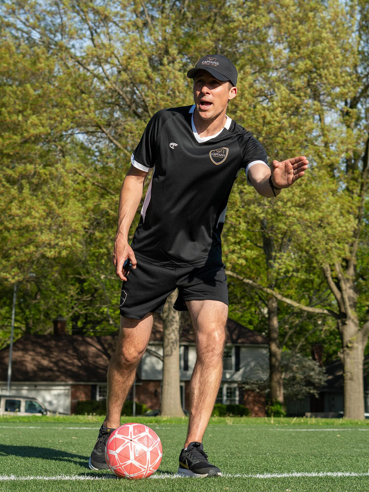 Matt Besler takes a knee to speak with young athletes at Captains Soccer Club; photo by David Henderson