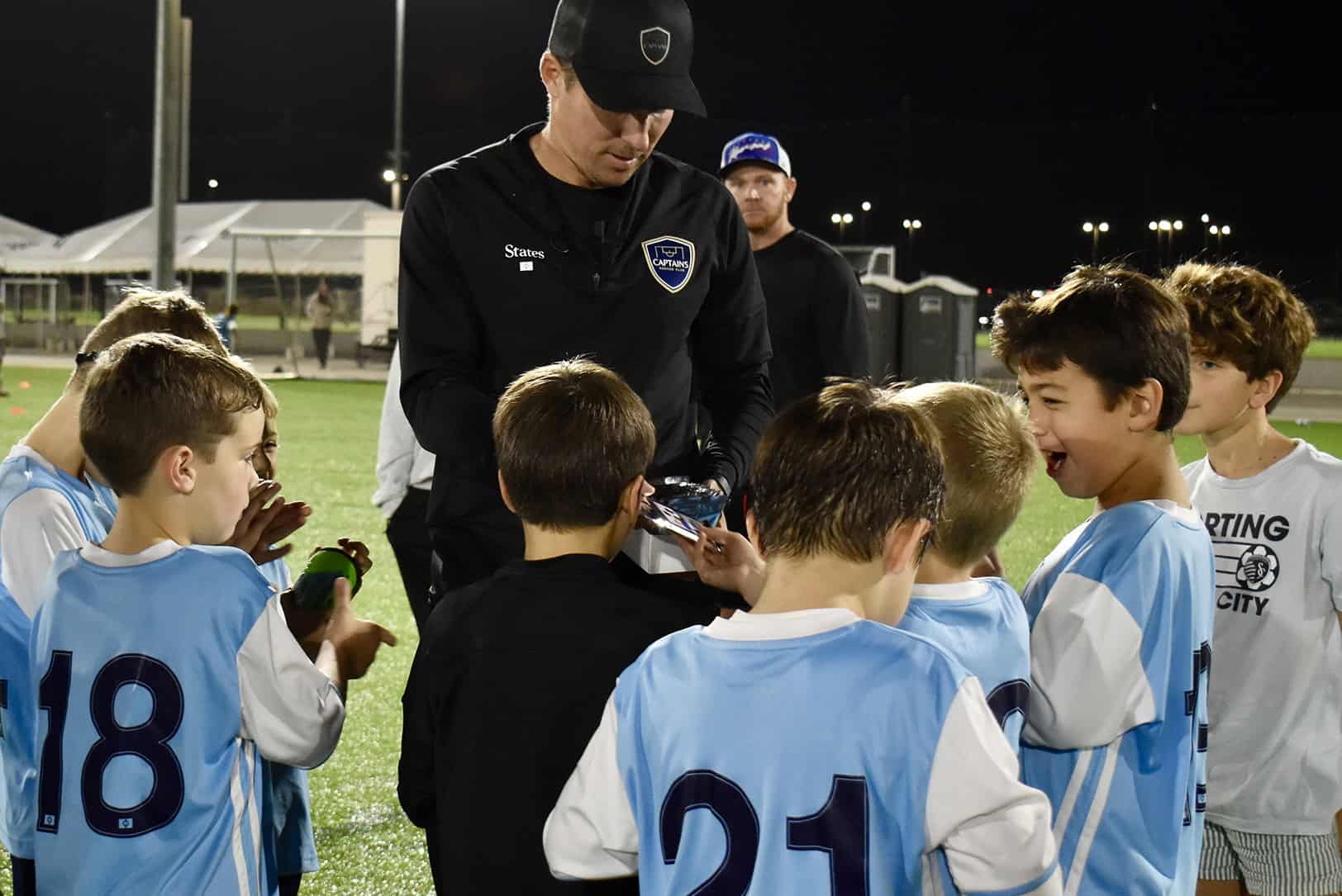 Matt Besler speaks with young athletes at a November 2025 practice; photo by Nikki Overfelt Chifalu, Startland News