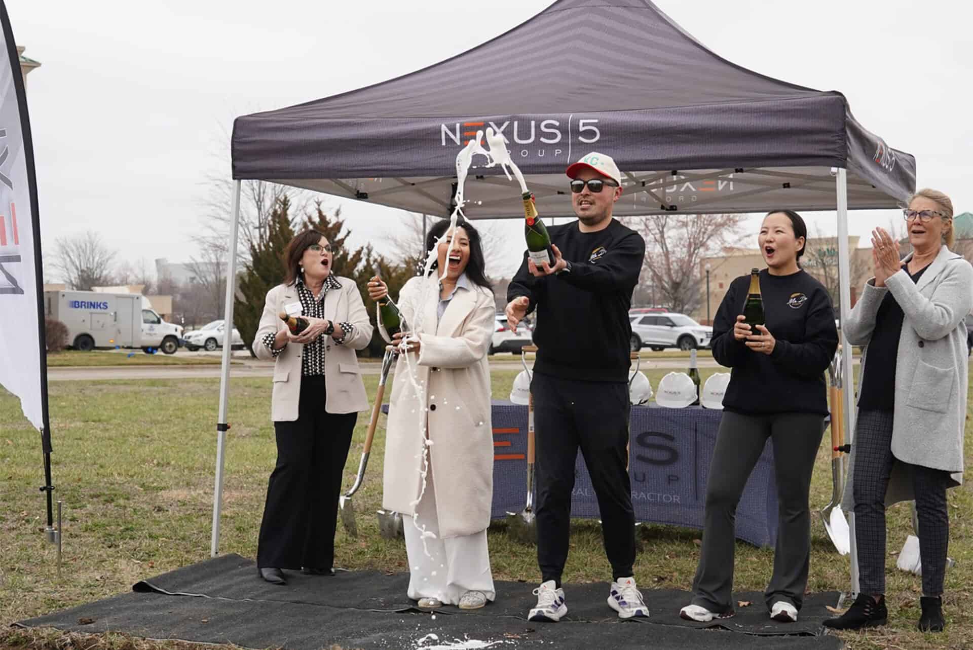 Johnny Chen and Boggie Otgonbayar celebrate in March 2026 along with Overland Park Chamber of Commerce and Nexus 5 Group officials at a groundbreaking ceremony for Mr D’s Donuts’ Overland Park location; courtesy photo