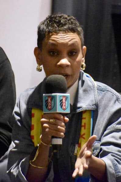 Nia Webster, assistant director of the neighborhood services department for the city of Kansas City, Missouri, shares insights from the city’s City of Entrepreneurs initiatives during a panel on World Cup readiness; photo by Nikki Overfelt Chifalu, Startland News
