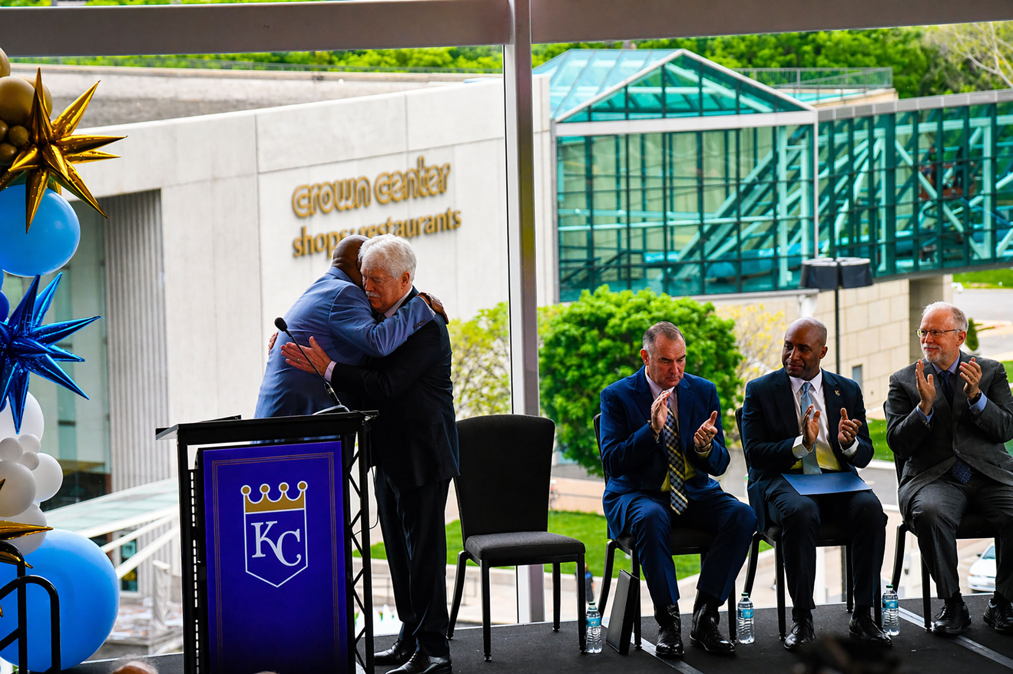 John Sherman, CEO and chairman of the Royals, shares an embrace with Bob Kendrick, president of the Negro Leagues Baseball Museum (NLBM), during an announcement event for the Royals new ballpark district at Crown Center; photo by Austin Barnes, Startland News