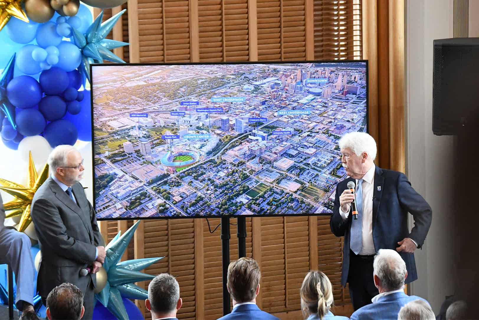 Don Hall Jr., executive chairman of the board of directors for Hallmark Cards, and John Sherman, CEO and chairman of the Royals, provide greater context to new renderings by Populous of a new ballpark at Crown Center; photo by Austin Barnes, Startland News