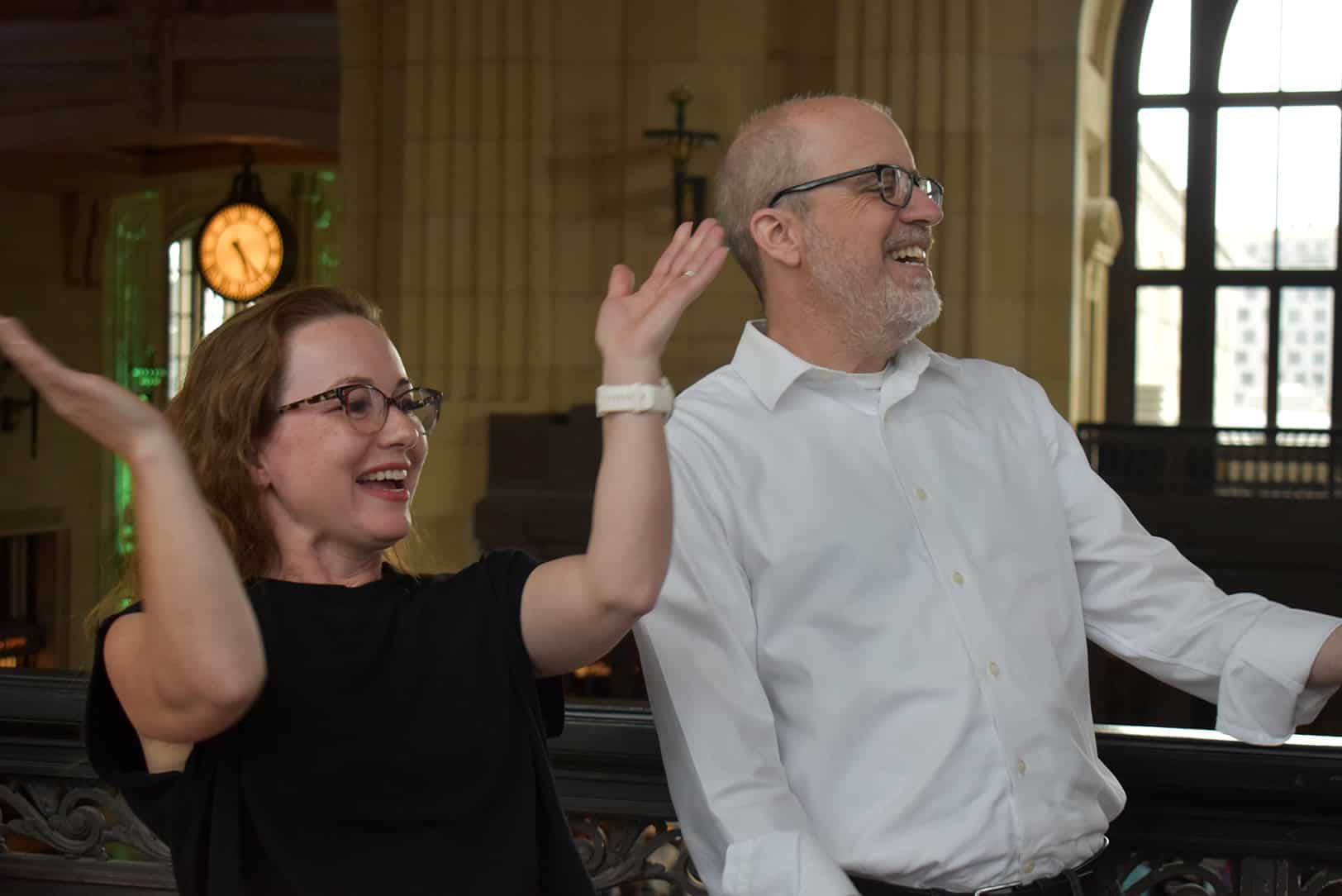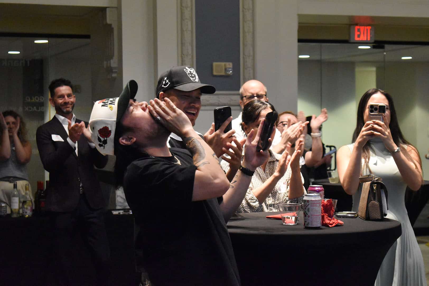 Vu Radley, co-founder of MADE MOBB, one of the Top 10 companies, cheers during a gathering of finalists at Union Station; photo by Taylor Wilmore, Startland News