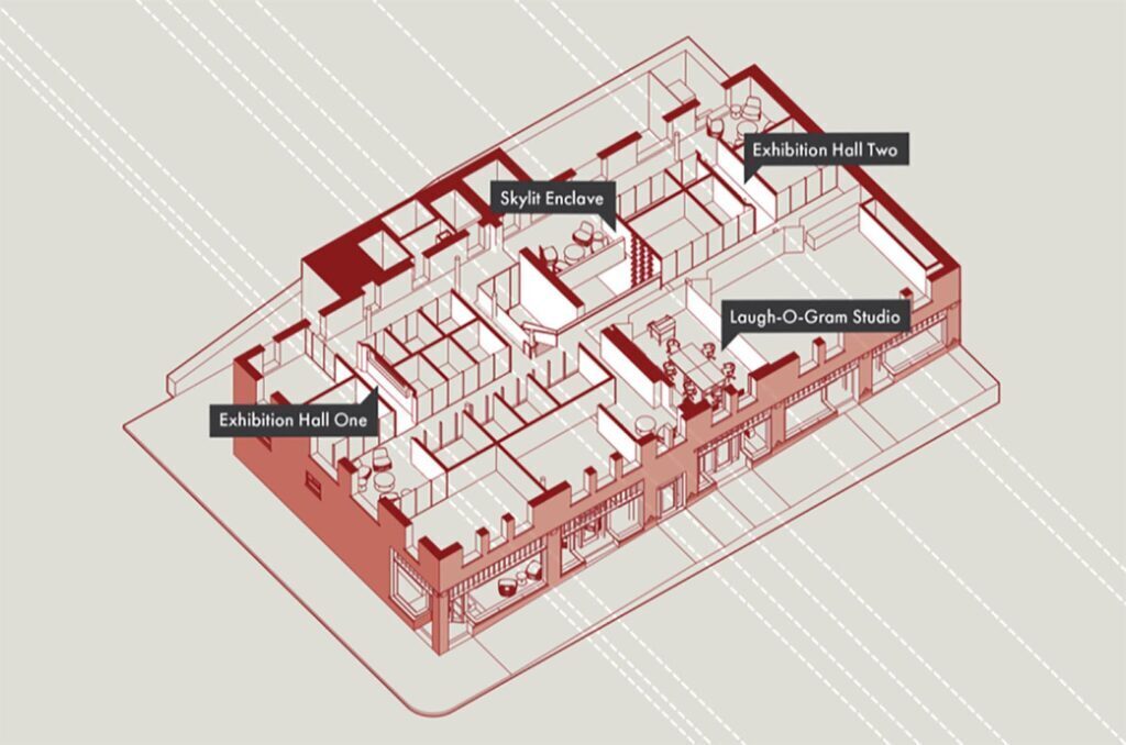 Kansas City is getting its first glimpse inside the reimagined space where Walt Disney first encountered the inspiration for Mickey Mouse. Thank You Walt Disney, Inc. — in partnership with DigiSTORY KC and Plexpod — unveiled GouldEvans-designed renderings of its 10,000-square-foot Laugh-O-gram Studios rehab project Thursday night. “We will begin working on some facade improvements hopefully…