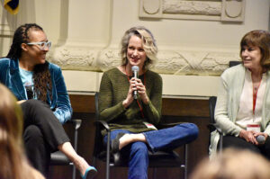 Vanessa Jupe, Leva, center, and fellow panelists participate in the “Rise of Women Entrepreneurs” conversation at the 2024 C3KC conference at Union Station; photo by Nikki Overfelt Chifalu, Startland News