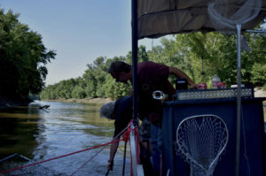 Greg Trial reaches down to pull a carp out of his net. Trial said the carp often tear through their nets; photo by Ceilidh Kern, Flatland