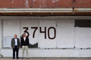 Byron Pendleton and Butch Rigby, Screenland Real Estate Services, outside the former Safeway building at 3740 Troost Ave.; photo by Taylor Wilmore, Startland News