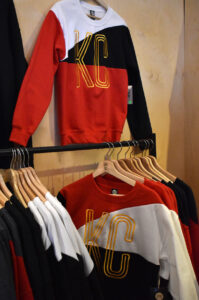 Colorblock sweatshirts from SewKC at the brand’s East Crossroads showroom; photo by Tommy Felts, Startland News