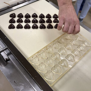 René Bollier pops chocolates out of molds during a tour of André’s Confiserie Suisse; photo by Joyce Smith