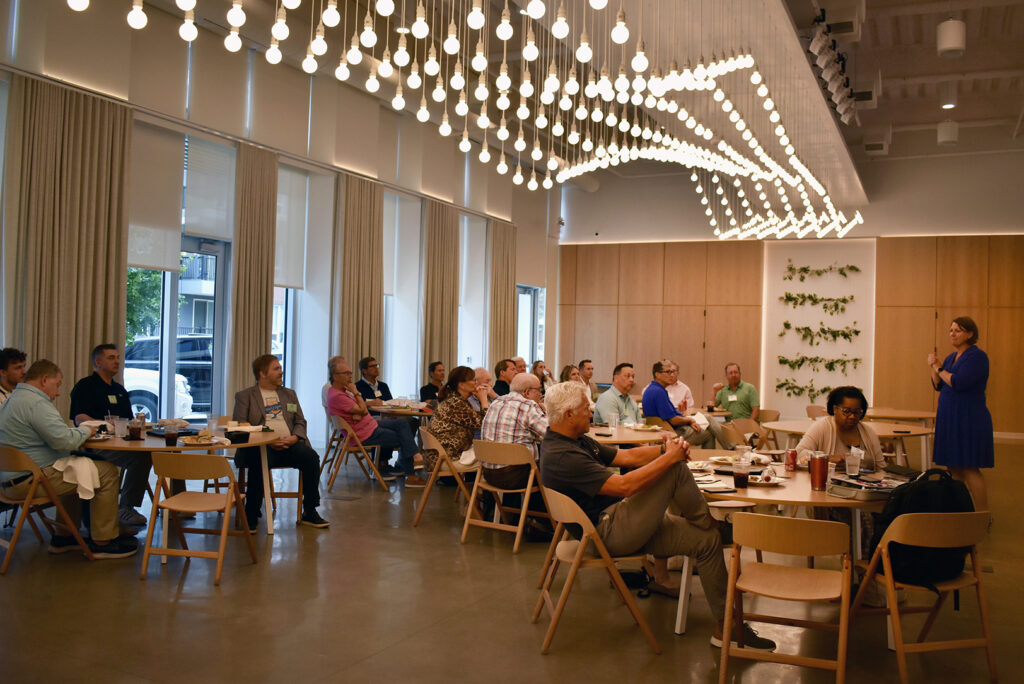 Rebecca Gubbels, managing director of Growth Mentoring Service, right, speaks during a monthly matching meeting between mentors and mentees; photo by Nikki Overfelt Chifalu, Startland News
