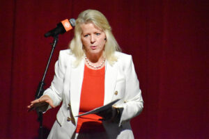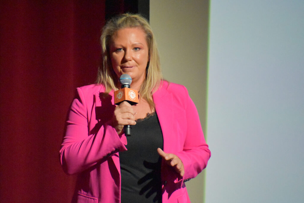 Karen Fenaroli, founder of the Pure Pitch Rally, speaks during the 2025 event at the Nelson-Atkins Museum of Art; photo by Taylor Wilmore, Startland News
