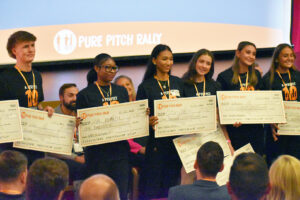 Entrepreneurship students award checks during the Pure Pitch Rally; photo by Nikki Overfelt Chifalu, Startland News