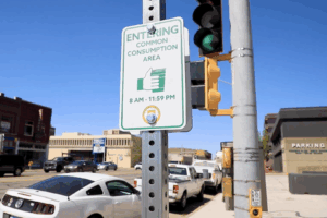 A sign noting a Common Consumption area in downtown Topeka; courtesy image