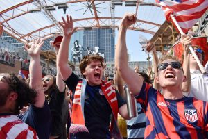 Fans react in June 2022 at Power & Light as news breaks that Kansas City will host during the 2026 World Cup; photos by Channa Steinmetz/Startland News
