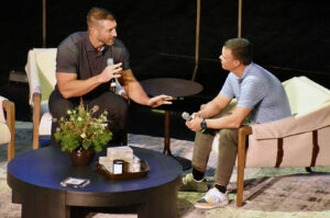 Tim Tebow, former quarterback for the Denver Broncos and four other NFL teams, shares the stage with Brent Beshore, CEO of Columbia-based private equity firm Permanent Equity and founder of Main Street Summit; photo by Nikki Overfelt Chifalu, Startland News
