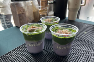 Three of HerCafe’s Blueberry Crumble matchas ready to be served; photo by Kowthar Shire, KCUR