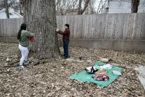 Alex Villalobos-McAnderson and Ivan Ramirez tie a ribbon around the Liberty Tree in Kansas City’s historic Northeast; photo by Nikki Overfelt Chifalu, Startland News