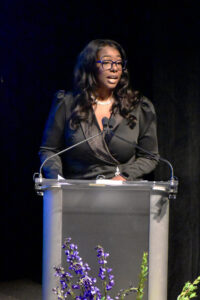 Shapree Marshall, founder of A Traveled Path Homes, speaks during the UMKC Henry W. Bloch School of Management’s annual Entrepreneur of the Year awards at H&R Block’s Copaken Stage; photo by Nikki Overfelt Chifalu, Startland News