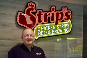 Todd Johnson, founder of Strips Chicken and Brewing, stands inside his Lenexa restaurant location; photo by Nikki Overfelt Chifalu, Startland News