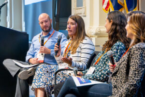 Julia Campbell, deputy director of the Missouri Technology Corporation (MTC), discusses accessing public funds to fund the growth of startups and small businesses during a November 2025 GEWKC panel conversation at Union Station; photo by Ayleen Bashir, KCSourceLink, UMKC Innovation Center