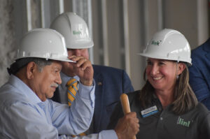 Michael Padilla, mayor of Topeka, and Stephanie Moran, senior vice president for innovation at Go Topeka and interim CEO of the Greater Topeka Partnership, celebrate the ceremonial groundbreaking for the Link Innovation Labs space in downtown Topeka; photo by Tommy Felts, Startland News