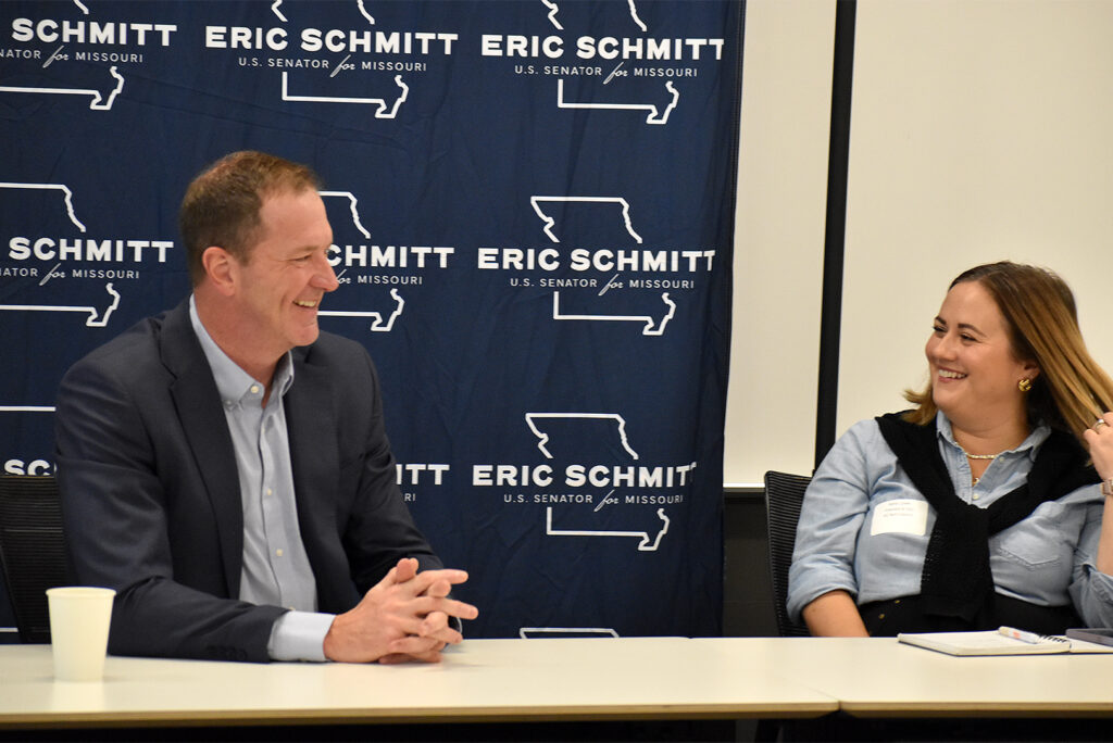 U.S. Eric Schmitt, R-Missouri, and Kara Lowe, CEO of KC Tech Council, chat during a roundtable conversation AI and tech in Kansas City; photo by Taylor Wilmore, Startland News