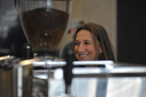 Stephanie Moran, senior vice president of innovation for GO Topeka, smiles as she awaits coffee from Sparrow Coffee Co. at Link Innovation Labs in Topeka; photo by Tommy Felts, Startland News